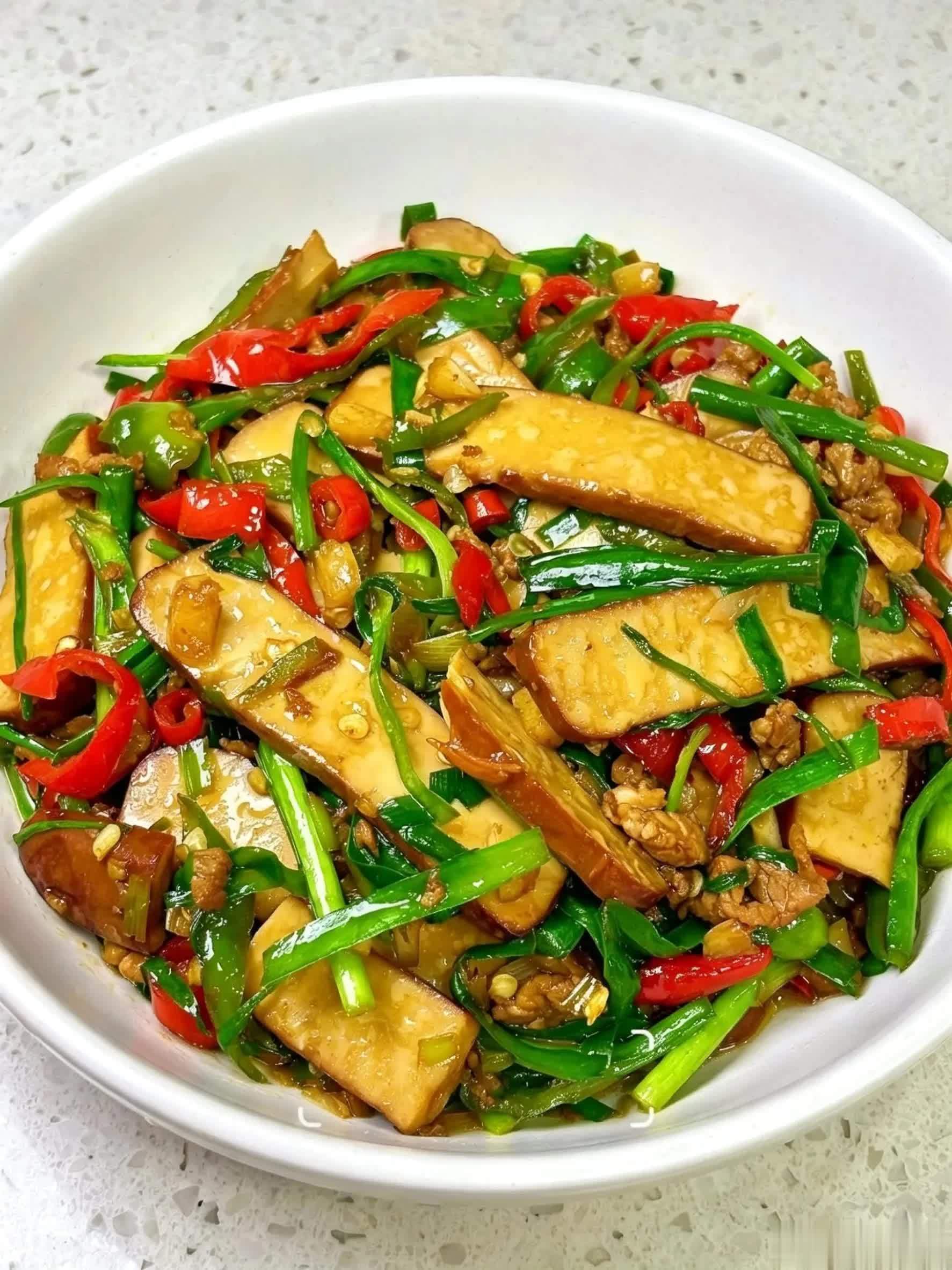 ✅ 亮点:韭菜被称为“起阳草”,清明后正是它最鲜嫩的时候,温补而不燥。配上高蛋白、低脂肪的鸡蛋干,一软一韧,口感很有层次。这道菜既借韭菜助阳气生发,又用鸡蛋干补充体力,比单炒鸡蛋更清爽利落,特别适合春日餐桌。