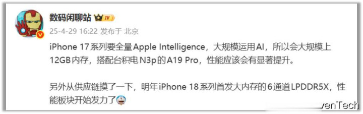 对于iPhone 18而言,变化的不仅仅是内存容量。正如四月份泄露的消息,苹果将采用6通道设计的LPDDR5X内存,这将显著增加内存带宽,从而帮助设备进一步提升性能。